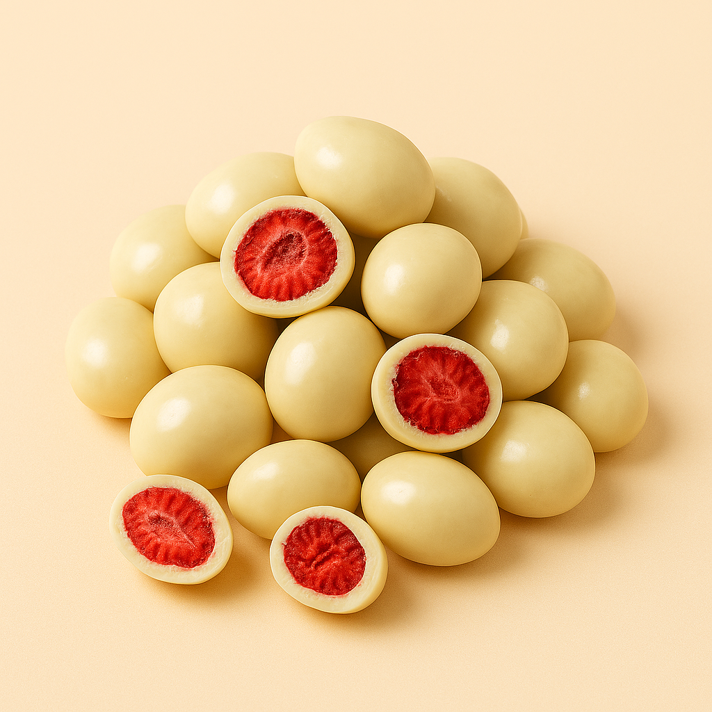 Fruchtige Erdbeeren, schonend gefriergetrocknet und mit samtiger Joghurt-Schokolade überzogen – eine unwiderstehliche Verbindung aus natürlicher Frische und cremiger Süße. Jeder Biss bietet eine perfekte Harmonie aus knackiger Frucht und zarter Schokolade.