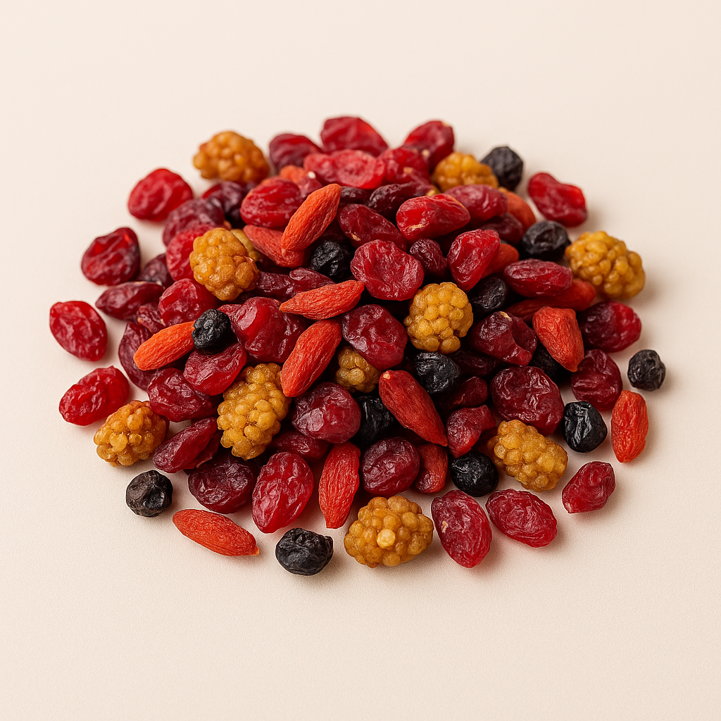 A colorful selection of superfruits — cranberries, mulberries, goji berries, golden berries (physalis), blueberries and cherries — naturally fruity, full of flavor, and rich in nutrients. The perfect mix for a healthy lifestyle and conscious snacking.